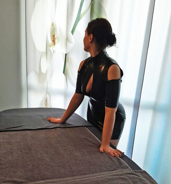 - Angebotene Optionen: Blind-Massage, leichtes Fesseln, Russisch, Spanisch, Duschritual, Whirlpool, Intimrasur, Entkleiden, Latex-Outfit